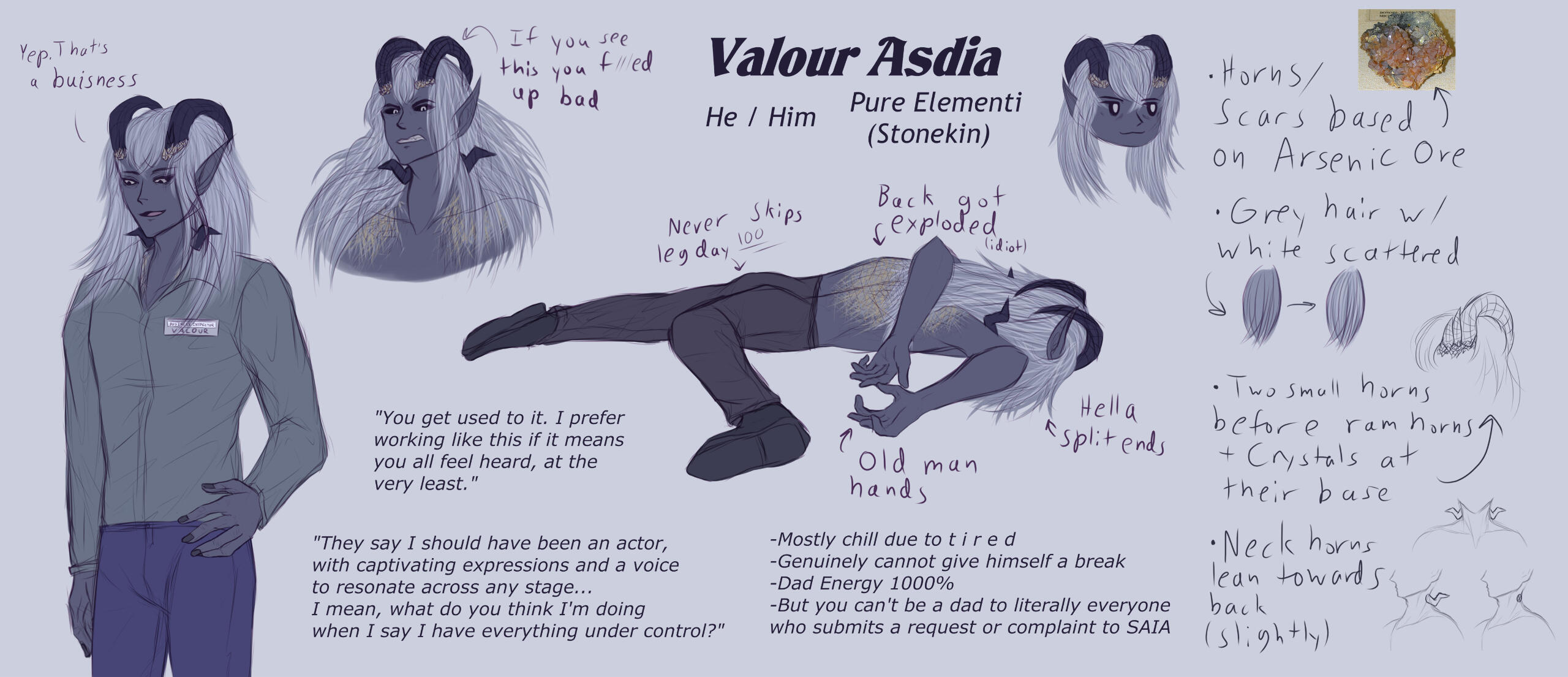 He will work himself to exhaustion before he'd let someone get hurt doing something he could have. He has a flare for theatrics, his movements fluid and confident whether it's in combat or simply pacing in thought. He gets quiet when the subject of his lineage is brought up.